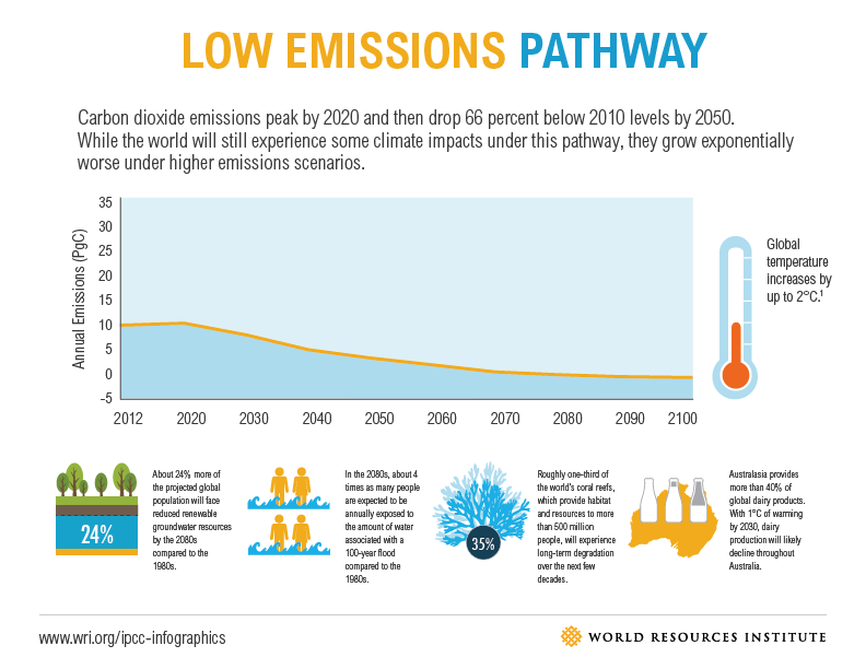 The first “Low Emissions” scenario is for a 66% drop in greenhouse emissions by 2050 compared to 2010 levels. It’s what we might call a soft landing, because under those conditions scientists believe we’ll be relatively safe. The world would have warmed only by 2 degrees C over pre-industrial levels (the level set by various international agreements). Still, almost of the quarter of the world would suffer depleted groundwater supplies by 2080, and many more people will face extreme flooding, the WRI says. So, life wouldn’t be peachy.
