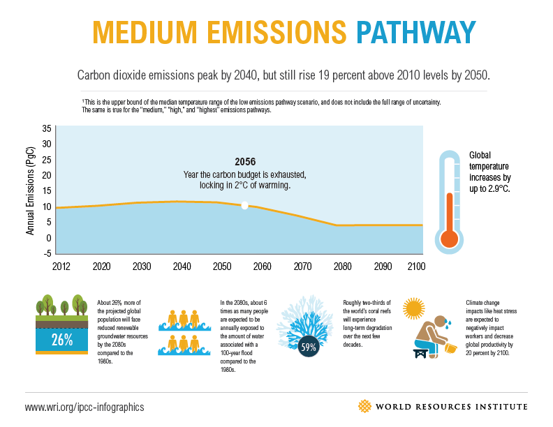 The “Medium Emissions” scenario sees increases in emissions until 2040 and the world exceeding its “carbon budget”–the level at which it should stay within the 2 degrees limit–by 2056. By 2100, the planet has warmed by 2.9 degrees, and economic productivity has fallen by 20%. By the 2080s, six times as many people are experiencing catastrophic flooding as the 1980s.