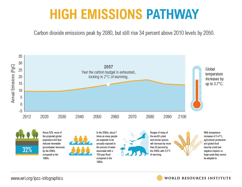 The “High Emissions” scenario doesn’t see emissions peaking until 2080, while global temperatures jump 3.7 degrees C by 2100. The carbon budget is exhausted in 2057. The impact on agricultural production is so heinous that adaption is no longer viable, the WRI predicts.