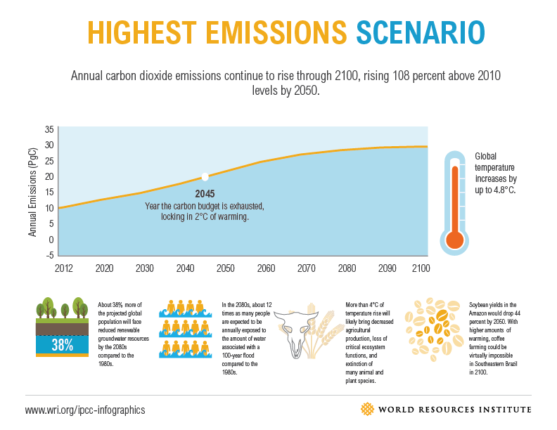 As if that’s not bad enough, there’s one last “Highest Emissions” scenario (they should have called it the Doomsday Scenario, really). It sees the carbon budget obliterated in 2045 and global temperatures increasing a whopping 4.8 degrees by century’s end. Many animals have become extinct and farming in some places, like southern Brazil, has become impossible.