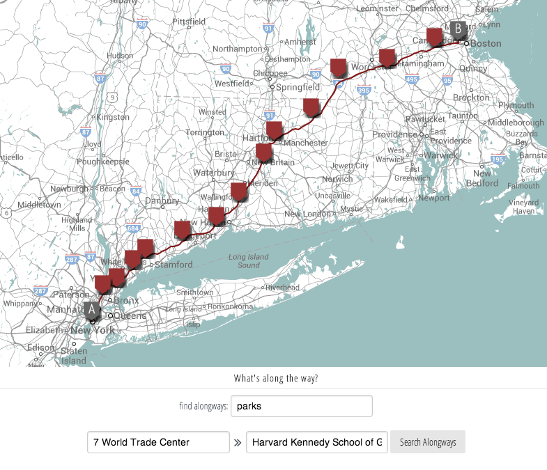 You type in your starting point and your destination, and where you’d like to stop along the way. It’ll map locations along your route. You could search for general terms, like “parks” or “bank,” or specific terms like Whole Foods or Amalgamated Bank. Alongways uses a wider search radius for longer routes, so it might show you results further out of your way on a several-hour car trip than if you were just driving from work to home.
