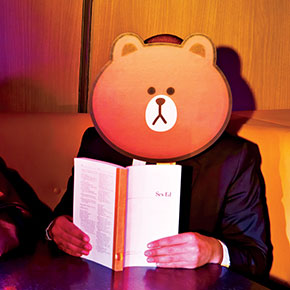 Line is headquartered in Shibuya Hikarie, a gleaming high-rise in the heart of Shibuya, the Times Square–like hub of commerce centered around one of Japan’s busiest train stations. I am here to meet Takeshi Idezawa, who was promoted from COO to CEO of Line Corp. in December 2014. Expecting Japanese formality, I’ve donned a suit and tie for the occasion, but Idezawa is dressed like a Silicon Valley exec, in a collarless gray shirt under a gray jacket. The offices are reminiscent of the Harajuku store, with larger-than-life-size figures of Brown, Cony, and their animated compatriots in the hall. Even the bottled water served on the premises sports Line characters on its labels.