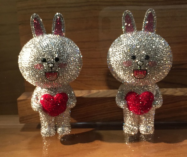 The shoppers jammed inside the story are snapping up a beguiling, bewildering range of items featuring the characters from the stickers. For ¥200 ($1.66) you can buy a pad of sticky notes in the shape of that bear, who’s known simply as Brown. If you spend ¥390,000 ($3,238), you can take home a Swarovski crystal-encrusted version of Cony, the rabbit. The check-out queue snakes all the way down the stairs to the far corner of the lower level.