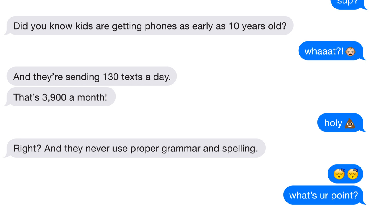 “What’s really interesting is that recent studies on the matter contradict each other. Some suggest that texting helps kids with spelling and grammar, while others argue the complete opposite,” says Weisburd. “From the conflicting studies (there’s a lot of them), we came to the conclusion that texting has the potential to improve spelling and grammar, but as of now, it’s not doing anything.”