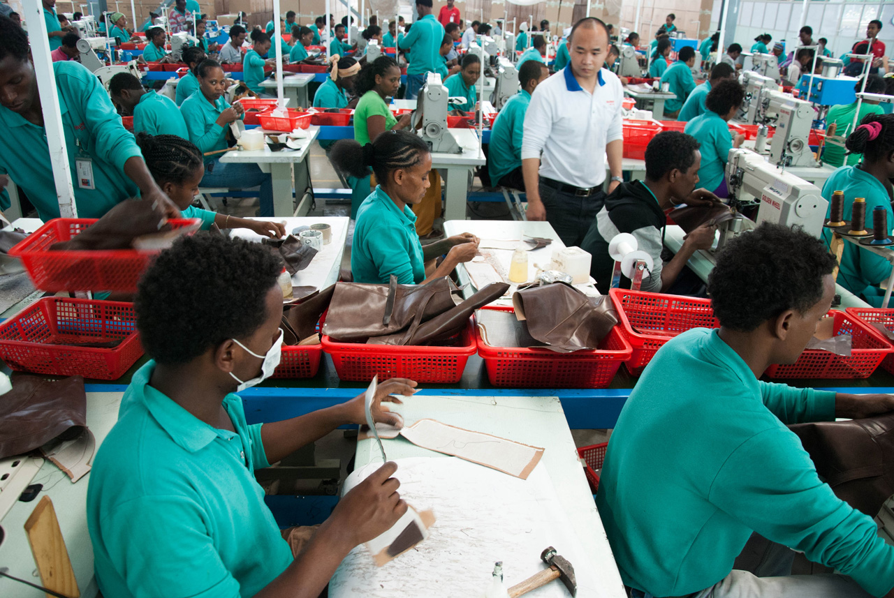 Ethiopian workers and Chinese management in the Huajian shoe factory in the Eastern Industry Zone near Addis Ababa, a Special Economic Zone modelled after China’s southern city of Shenzhen.