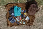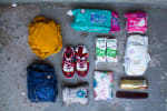 A 20-year-old mother is carrying supplies for her 10-month-old baby: a hat and socks, a yellow headband, a jar of baby food, napkins for diaper changes, some medicine, a wallet with an ID and money, the baby’s vaccination documents, sunscreen, toothpaste, and a cell phone charger.