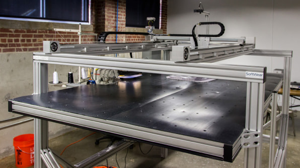 SoftWear’s technology uses computer vision to watch and analyze fabric so the system can move the material while sewing. “What we did was approach it and look at it from how a seamstress actually operates,” says Rajan. “The first thing they do is use their eyes, and based on their eyes, they do micro and macro manipulations of the fabric with their fingers and hands and elbows and feet. So a robot replicates all of those functions.”