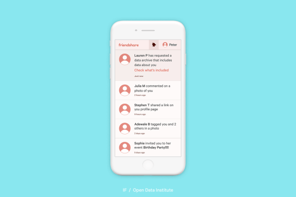 For Gold as well, designers can pick up where the law fails. For instance, the idea of data portability doesn’t take into account that data can often be tied to many people–take your utility bill if you live in a shared house, or even your Facebook data. Gold and her organization Projects By IF recently published a new study on this very topic in collaboration with the Open Data Institute, and included a series of prototypes posing ways in which data portability could function.