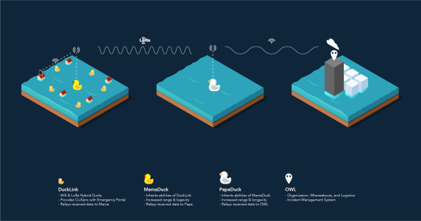 Project Owl–an acronym that stands for “organization, whereabouts, and logistics”–will air-drop (likely via drone) their plucky “Clusterduck” armada into a disaster area (they can float in water or just sit wherever they land). The devices are small, hexagonal rubber balls that are waterproof, durable, and house mini-Wi-Fi relays, which can work together to create an ad hoc mobile network.
