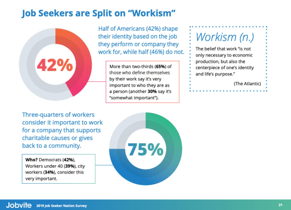 According to Jobvite’s annual Job Seeker Nation survey, 42% of American workers define themselves by the jobs they perform and/or the companies they work for, and that number rises to 45% among those under the age of 40. Furthermore, of the 42% who say that they define themselves through their work, 65% say it’s “very important” to who they are as people.