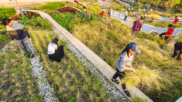 A massive new green roof is designed to help capture rainwater in one neighborhood, on the Bangkok campus of Thammasat University. Designed to mimic traditional rice terraces, one part of the roof serves as an urban farm, now the largest farm of its kind in Asia; the cascading terraces use rain to grow rice along with native plants, and then store as much as 3 million gallons of water in detention ponds to be used later for irrigation in a drought.