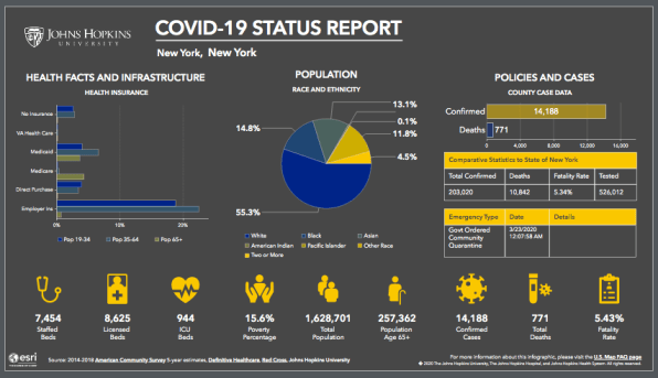 The latest iteration of JHU’s map of the United States has just been updated with a wealth of county-level public health data to help local governments and medial professionals better understand how the coronavirus pandemic is impacting their area. The map, powered by software from spatial analytics firm Esri, now includes the following data, all searchable by county: