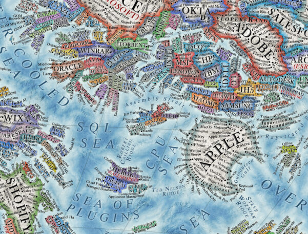[Image: Martin Vargic]“Many of the world’s largest companies are not shown on the map, as they have a minimal web presence and their websites have way too little traffic to put them even in the top 5,000,” Vargic says. These missing giants include oil companies (Shell, Exxon Mobil, and Saudi Aramco), car companies (GM, Volkswagen, and Honda), and electronics companies (Foxconn, Fujitsu, and Taiwan Semiconductor).
