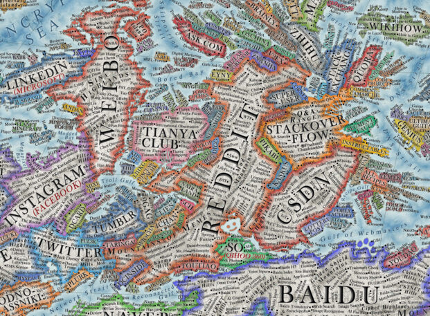 Vargic released his first Map of the Internet in 2014. But nearly a decade later, he felt it was time for an update. “The landscape of the internet has changed considerably and the old map became more and more outdated,” he says. “At the same time, I improved considerably as an artist and designer, and thought that the Map of the Internet deserved to be revisited, and the concept further explored and realized on an even more ambitious and comprehensive scale.”