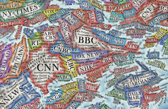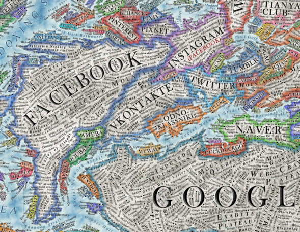 Designer Martin Vargic sees the internet as something different. He imagines it to look like Earth’s own globe from a vintage atlas, full of continents dedicated to topics like news, e-commerce, social media, and pornography. Then inside these continents live countries like CNN and Breitbart, Amazon and Alibaba, Facebook and Twitter, and Pornhub and Xvideos. Their borders are painted boldly in their brand colors, depicting an internet that is going more international by the day.