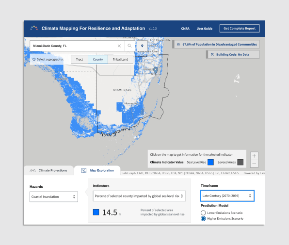 [Image: CMRA]A new set of tools from the federal government, built by the mapping company Esri, maps out climate impacts in real-time, and also shows what’s coming as the climate crisis intensifies. The new portal is designed to help cities, businesses, and residents better understand the risks “and give them tools so they can help prepare their communities and make them more resilient in the face of these severe stresses,” David Hayes, special assistant to the president for climate policy, said in a press conference announcing the new platform.