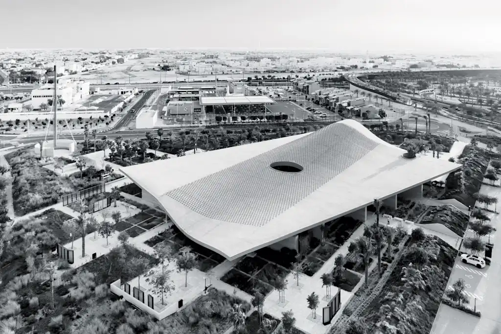 At the Al-Mujadilah Center and Mosque for Women in Doha, Qatar, the roof is the building. Like a gigantic sheet of white paper gently falling onto the desert floor, the undulating rectangular roof drapes the 50,000-square-foot complex, shading its edges while also sprinkling light inside.